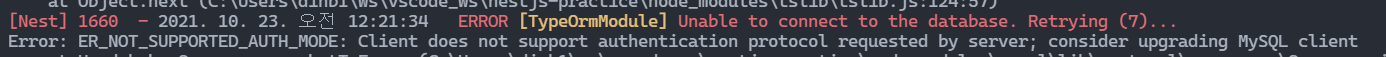 Nest.js에서 TypeORM에 외부 MySQL을 연동하려고 Configuration을 진행한 후, 서버를 동작시키니 다음과 같은 에러가 발생하였다.